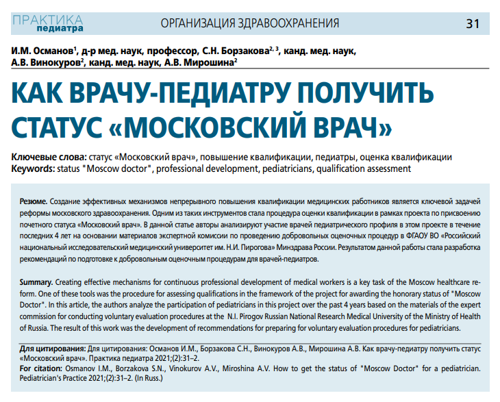 Совместно с главным внештатным специалистом по педиатрии и детской нефрологии ДЗМ, профессором И. М. Османовым и сотрудниками ОМО по педиатрии НИИОЗММ ДЗМ разработаны рекомендации по подготовке к добровольным оценочным процедурам по присвоению почетного статуса «Московский врач» для врачей-педиатров. Статья опубликована во втором номере журнала «Практика педиатра» за 2021 год и продолжает тематическую рубрику «Организационно-методический отдел по педиатрии рекомендует». Авторы провели анализ участия врачей педиатрического профиля в оценочных процедурах в течение последних 4 лет, выявили этапы, вызывающие наибольшие затруднения, и предложили рекомендации по их преодолению.