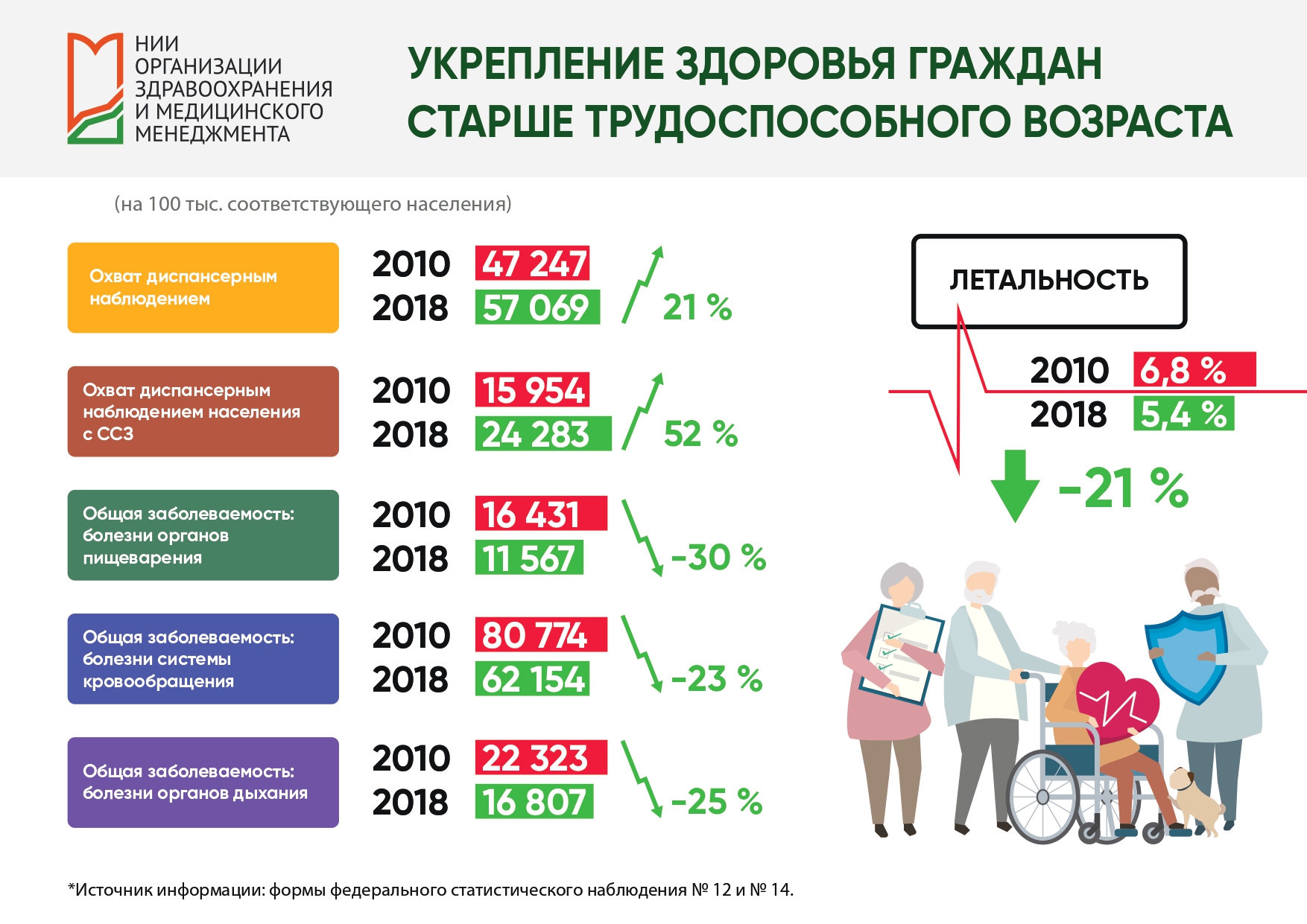Результатом профилактической работы, проводимой амбулаторно-поликлиническими организациями, и введения новых технологий в работу стационарного звена можно считать снижение показателя летальности среди населения старше трудоспособного возраста в стационарах за период 2010–2018 гг. с 6,8 % до 5,4 %.